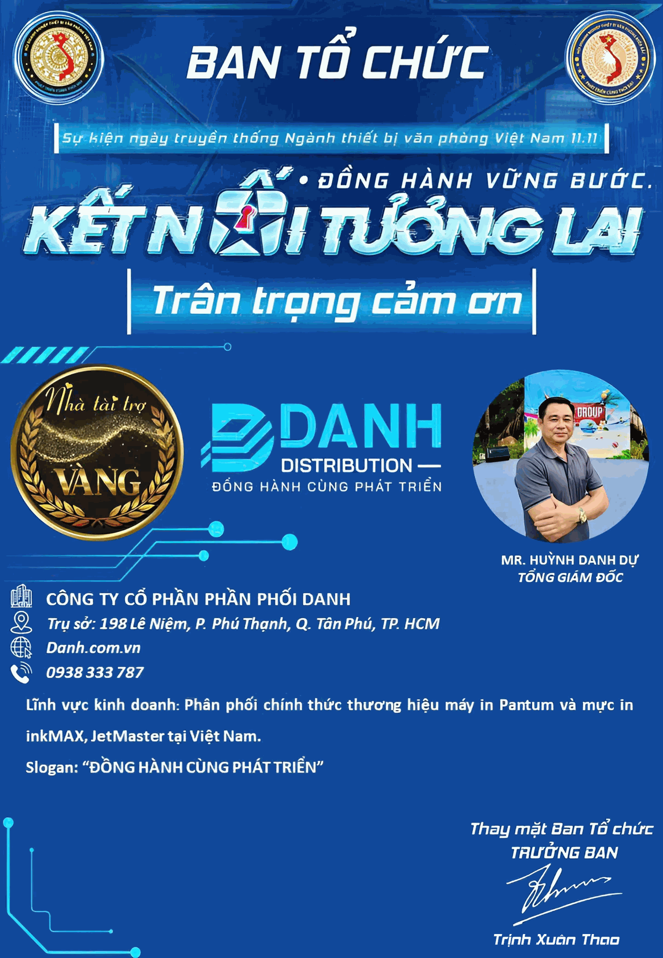Công ty Cổ phần phân phối Danh xin gửi lời chúc mừng chân thành nhất đến sự kiện ngày truyền thống Ngành thiết bị văn phòng Việt Nam sắp tới. Chúng tôi rất vinh dự được đồng hành cùng sự kiện ý nghĩa này với vai trò nhà tài trợ vàng.